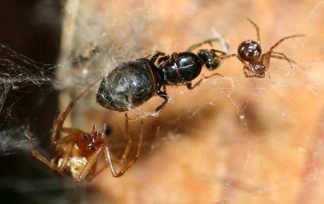 Une fois les potes partis, j'ai chopé une autre fourmi et je l'ai sadiquement jeté dans la toile pour profiter du spectacle (je sais, c'est dégeulasse...). J'ai eu le palisir de voir sortir une 2eme petite araignée (peut être le mâle) qui a donné un coup de main à la première (2eme et 3eme photo).