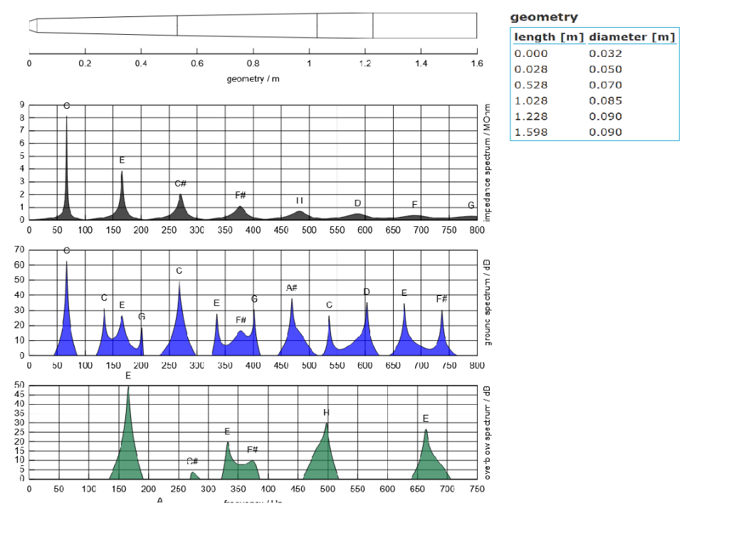 Ma grande peur est celle là : j'ai lu que Didgmo était très correct pour trouver le spectre audio de la config (deuxième graphe), mais moins pour représenter fidèlement l'impédance, la back pressure (donc je peux pas faire confiance au 8 qui est affiché ici). tout le monde ici dit bien que le premier tiers doit être plutôt serré pour augmenter la BP, mais je suis plutôt jeux occidental, et j'ai vraiment envie d'avoir un didg avec de l'espace à l'intérieur (en tout cas pour l'instant, on verra après pour les autres !)